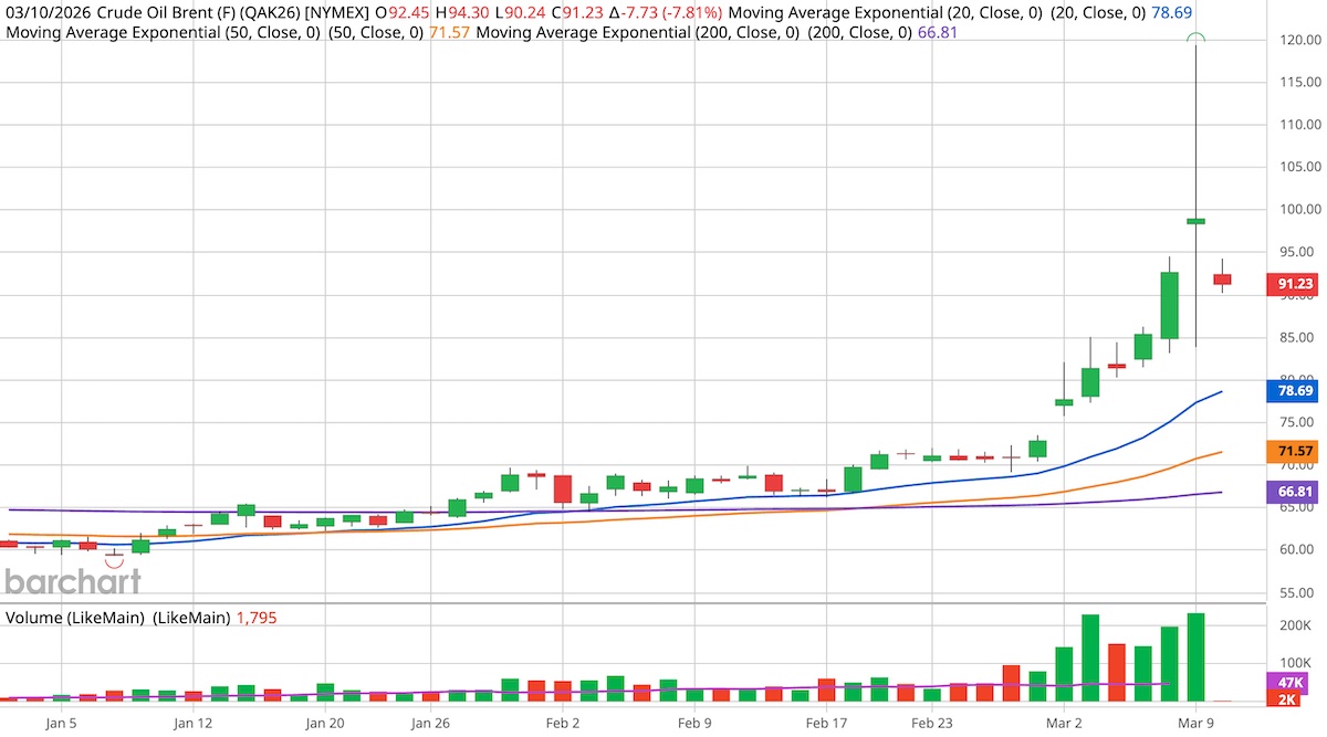 Oil prices pulled back dramatically in the afternoon following President Trump’s remarks on the Iran war, with both benchmarks plunging as much as 30% from their peaks, before rebounding and stabilizing. Brent Crude and WTI last traded at $92.08 and $87.70, respectively.